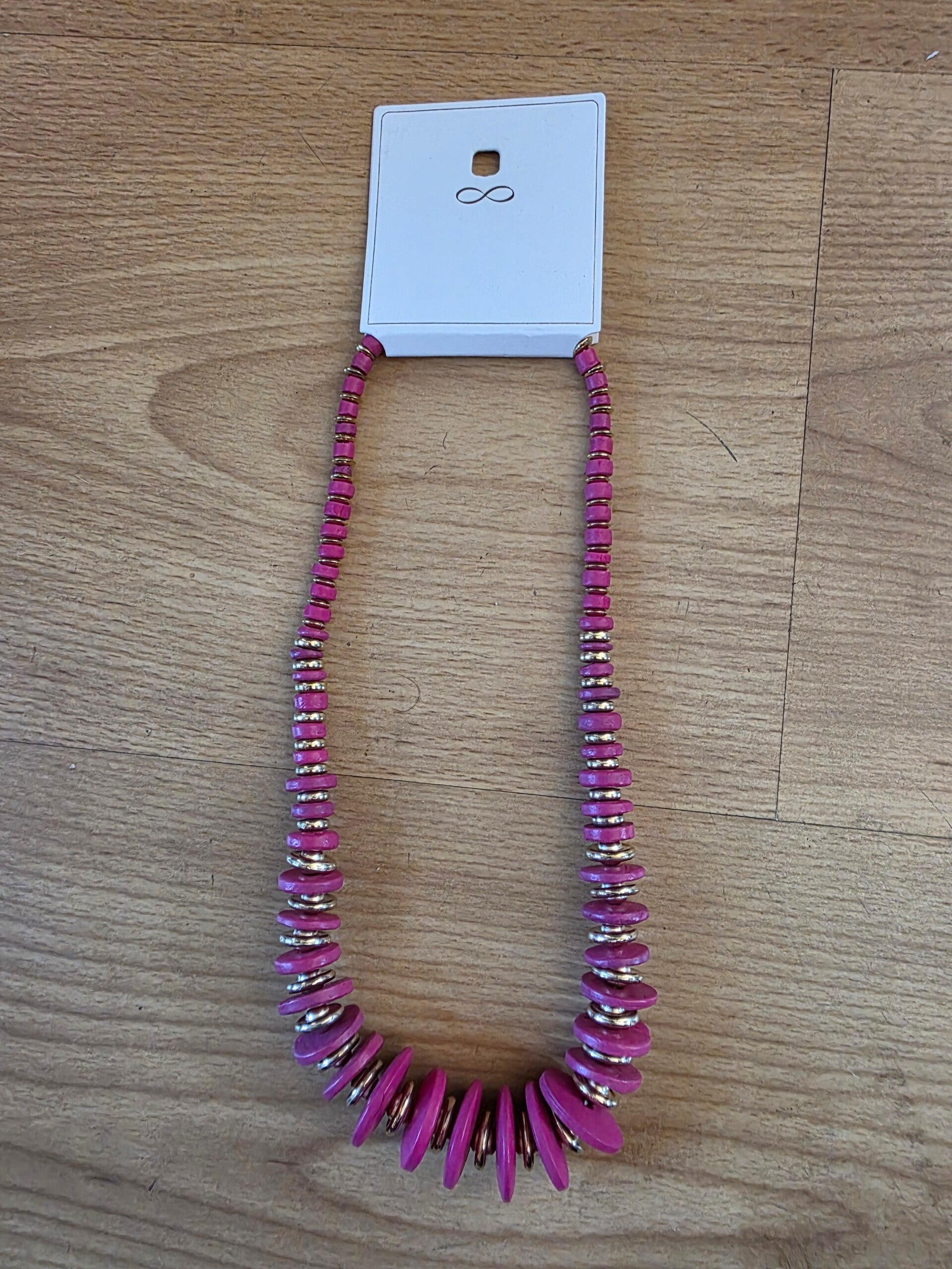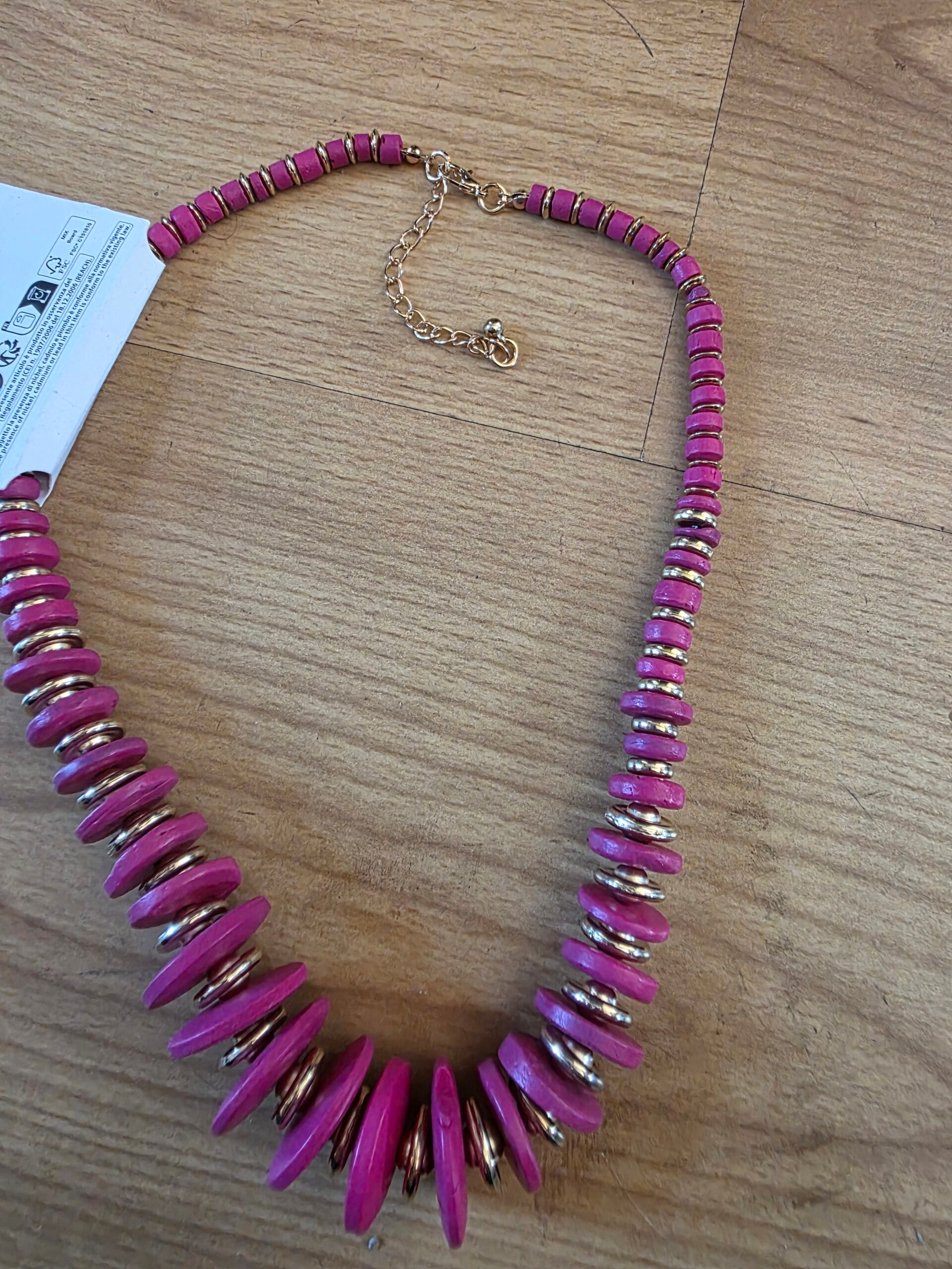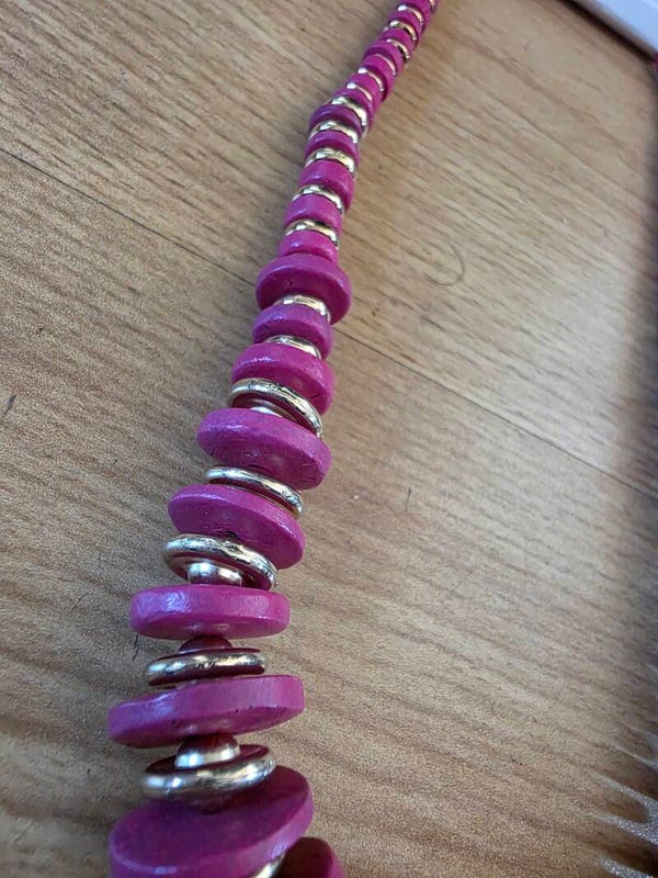 Die Halskette ist aus Holzperlen gefertigt. Durch den Mix von pinkfarbigen Holzperlen und silbernen Plastikperlen entsteht ein schönen sommerlicher Look. Durch den verstellbarem Verschluss ist von der Länge einstellbar.